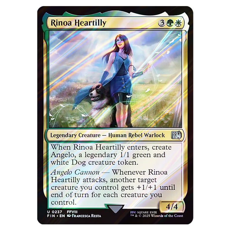 When Rinoa Heartilly enters, create Angelo, a legendary 1/1 green and white Dog creature token. Angelo Cannon — Whenever Rinoa Heartilly attacks, another target creature you control gets +1/+1 until end of turn for each creature you control.