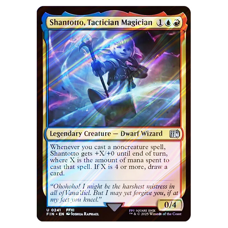 Shantotto, Tactician Magician is a Uncommon, Legendary Creature - Dwarf Wizard card from the Magic The Gathering set Universes Beyond - Final Fantasy (MTGSC-FIN-0241)