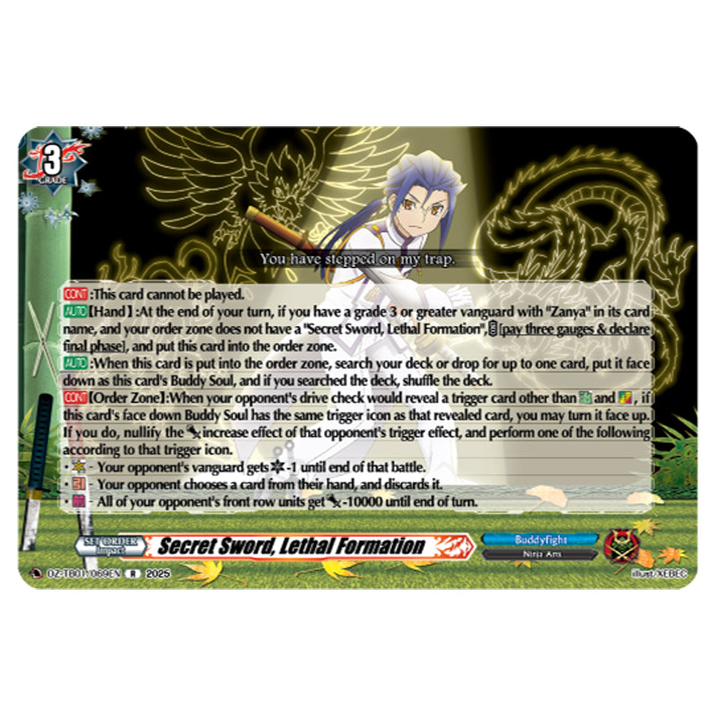 [CONT]:This card cannot be played. [AUTO](Hand):At the end of your turn, if you have a grade 3 or greater vanguard with "Zanya" in its card name, and your order zone does not have a "Secret Sword, Lethal Formation", [COST][pay three gauges & declare final phase], and put this card into the order zone. [AUTO]:When this card is put into the order zone, search your deck or drop for up to one card, put it face down as this card's Buddy Soul, and if you searched the deck, shuffle the deck. [CONT]Order Zone:When your opponent's drive check would reveal a trigger card other than [Heal] and [Over], if this card's face down Buddy Soul has the same trigger icon as that revealed card, you may turn it face up. If you do, nullify the [Power] increase effect of that opponent's trigger effect, and perform one of the following according to that trigger icon. ・[Critical] ‐ Your opponent's vanguard gets [Critical]-1 until end of that battle. ・[Draw] ‐ Your opponent chooses a card from their hand, and discards it. ・[Front] ‐ All of your opponent's front row units get [Power]-10000 until end of turn.