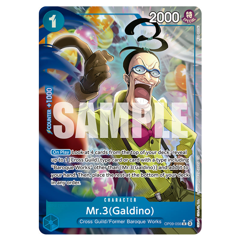 Effect [On Play] Look at 4 cards from the top of your deck; reveal up to 1 {Cross Guild} type card or card with a type including "Baroque Works" other than [Mr.3(Galdino)] and add it to your hand. Then, place the rest at the bottom of your deck in any order.