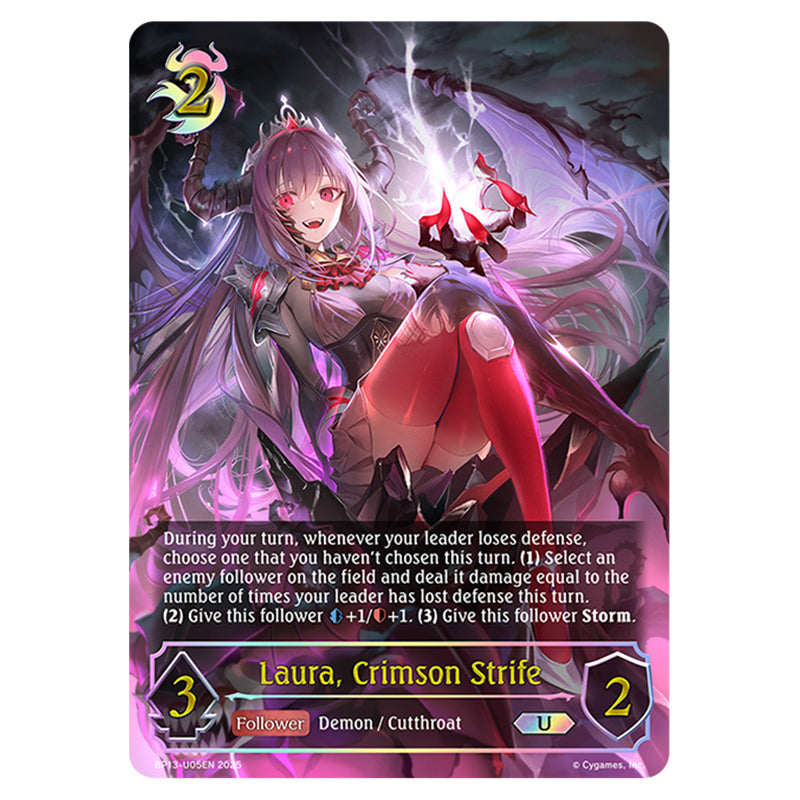 Laura, Crimson Strife is a Follower card from the Shadowverse Evolve set Worldreaver's Descent & Dominion of Darkness (BP13-U05EN)