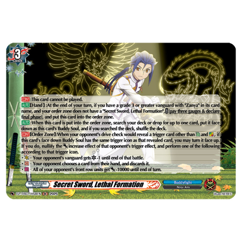 [CONT]:This card cannot be played. [AUTO](Hand):At the end of your turn, if you have a grade 3 or greater vanguard with "Zanya" in its card name, and your order zone does not have a "Secret Sword, Lethal Formation", [COST][pay three gauges & declare final phase], and put this card into the order zone. [AUTO]:When this card is put into the order zone, search your deck or drop for up to one card, put it face down as this card's Buddy Soul, and if you searched the deck, shuffle the deck. [CONT]Order Zone:When your opponent's drive check would reveal a trigger card other than [Heal] and [Over], if this card's face down Buddy Soul has the same trigger icon as that revealed card, you may turn it face up. If you do, nullify the [Power] increase effect of that opponent's trigger effect, and perform one of the following according to that trigger icon. ・[Critical] ‐ Your opponent's vanguard gets [Critical]-1 until end of that battle. ・[Draw] ‐ Your opponent chooses a card from their hand, and discards it. ・[Front] ‐ All of your opponent's front row units get [Power]-10000 until end of turn.