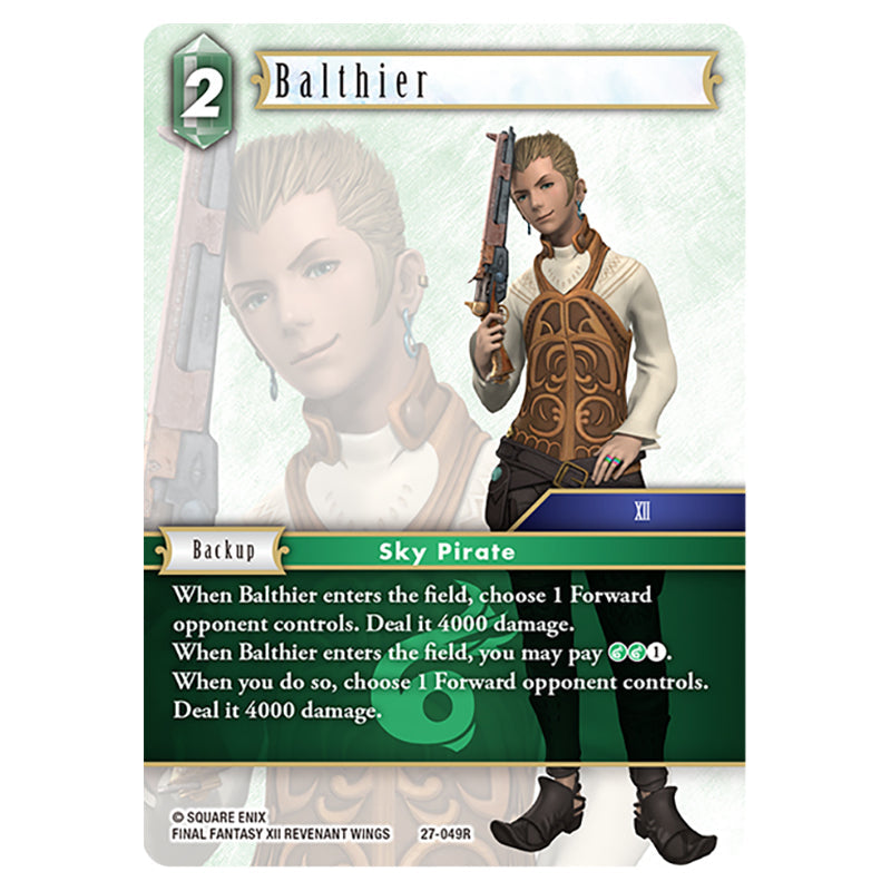 Balthier is a Rare (Backup / Wind) foil card from the Final Fantasy set Journey of Discovery (27-049R)