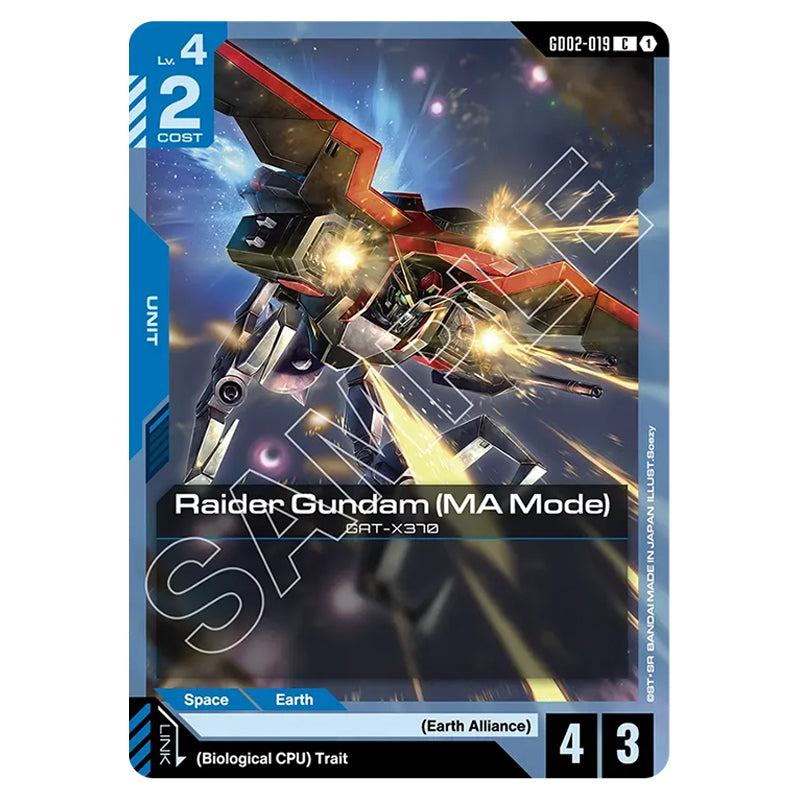 Raider Gundam (MA Mode) is a UNIT card from the Gundam Card Game set Dual Impact (GD02-019)