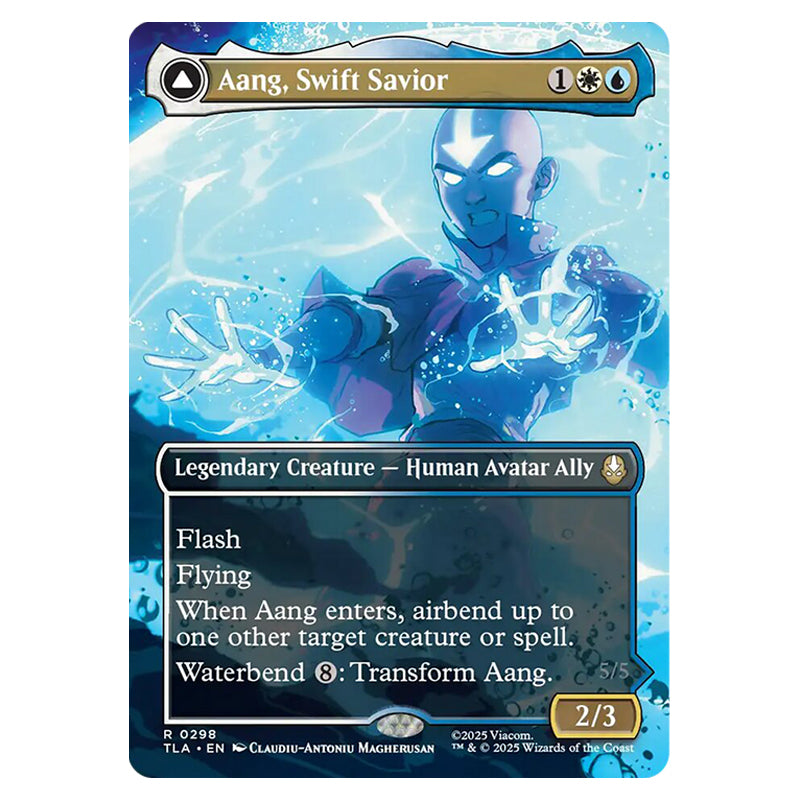 Aang, Swift Savior / Aang and La, Ocean's Fury is a Rare, Legendary Creature - Human Avatar Ally / Legendary Creature - Avatar Spirit Ally card from the Magic The Gathering set Avatar The Last Airbender (MTGSC-TLA-0298)