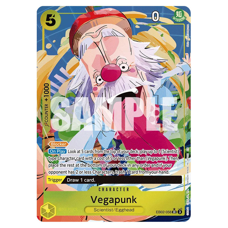 Effect [Blocker] [On Play] Look at 5 cards from the top of your deck; play up to 1 {Scientist} type Character card with a cost of 5 or less other than [Vegapunk]. Then, place the rest at the bottom of your deck in any order and if your opponent has 2 or less Characters, trash 1 card from your hand.