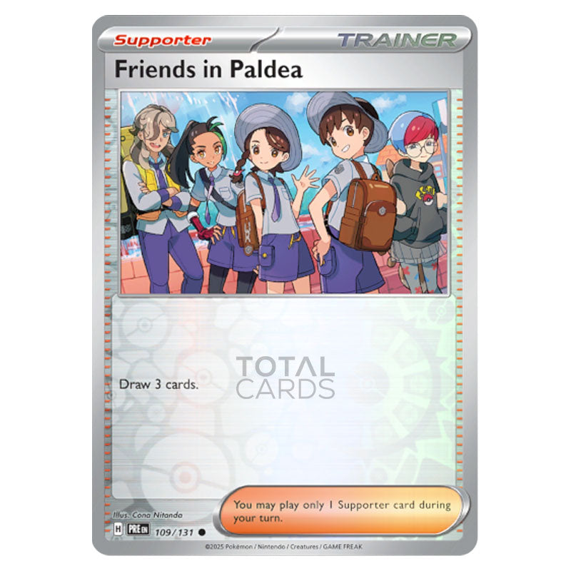 Friends in Paldea is a Common (Supporter) type Trainer card from SV8.5 - Prismatic Evolutons Reverse Holo (109/131)