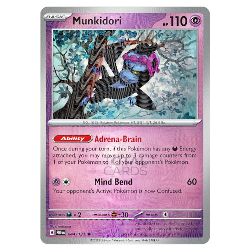 Munkidori is a Rare (Basic) Psychic type Pokémon card from SV8.5 - Prismatic Evolutons Reverse Holo Master Ball (044/131)