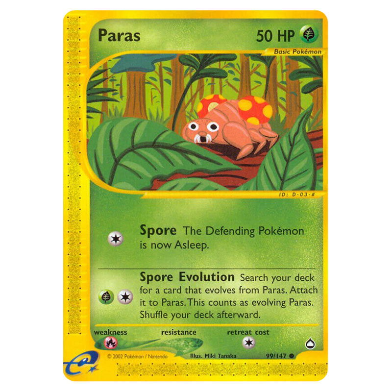 Paras is a Common (Basic) Grass type Pokémon card from ECARD2 - Aquapolis (099/147)