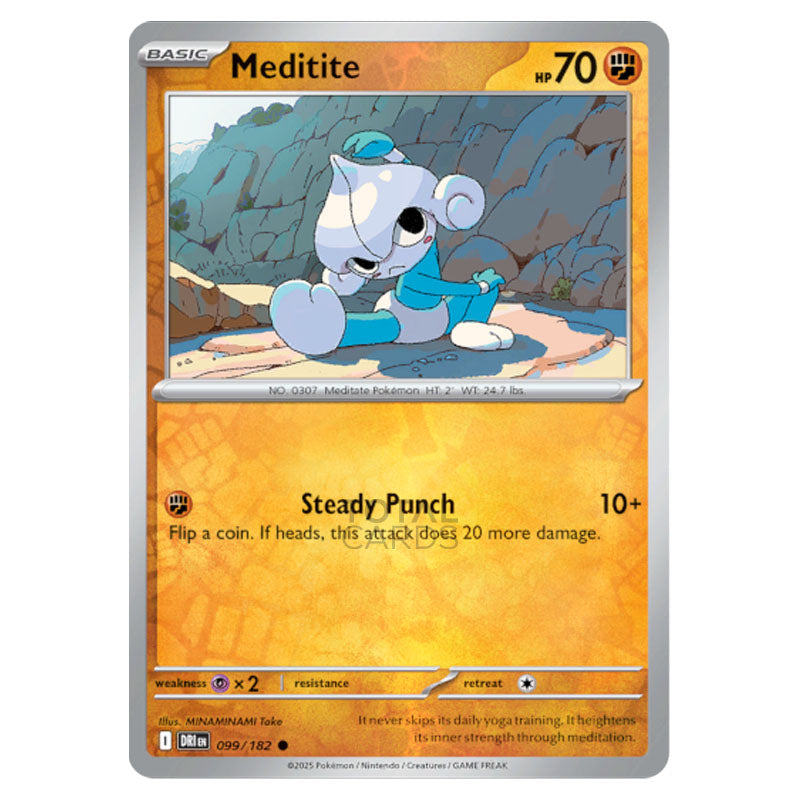Meditite is a Common (Basic) Fighting type Pokémon card from SV10 - Destined Rivals Reverse Holo (099/182)