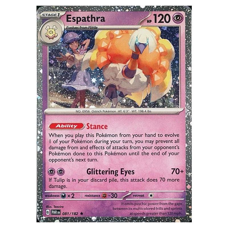 Espathra is a Rare (Stage 1) Water type Pokemon card from Paradox Rift. (081/182). This Cosmo Holo was originally found in the Paradox Rift Checklane Blisters.