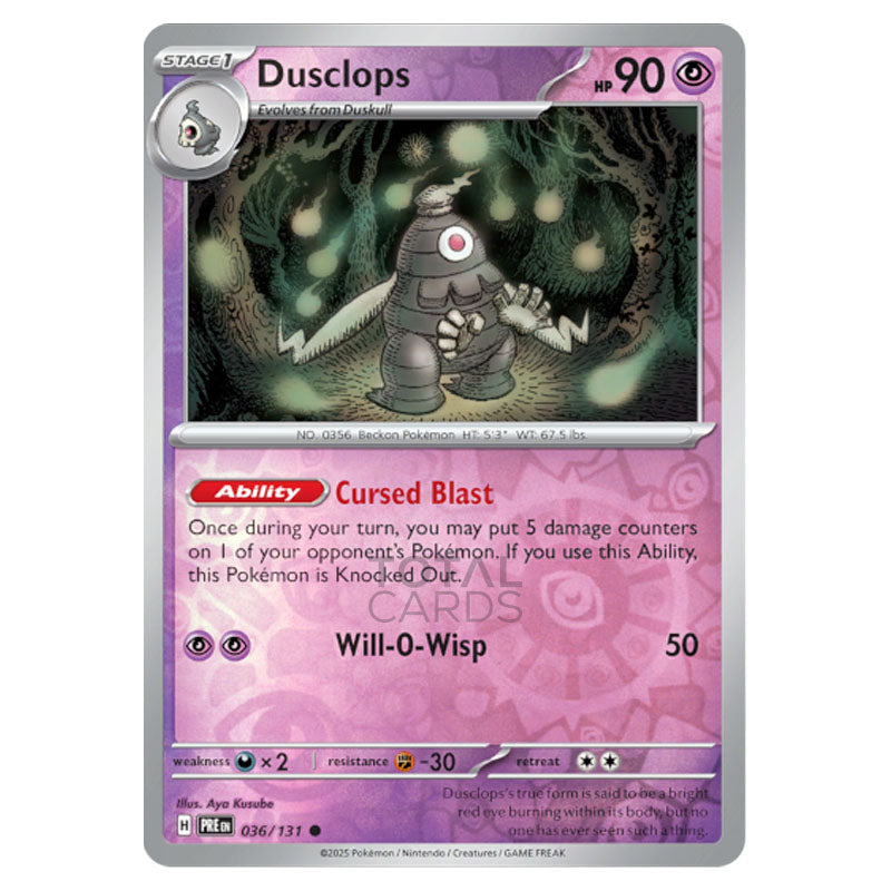 Dusclops is a Common (Stage 1) Psychic type Pokémon card from SV8.5 - Prismatic Evolutons Reverse Holo (036/131)