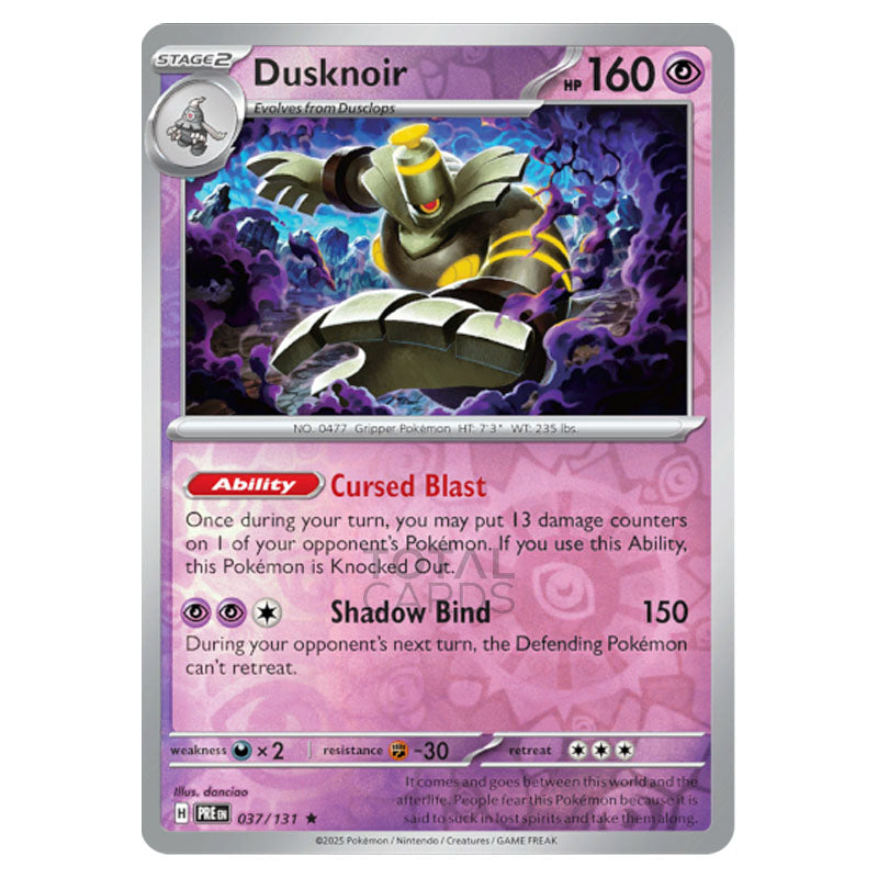 Dusknoir is a Rare (Stage 2) Psychic type Pokémon card from SV8.5 - Prismatic Evolutons Reverse Holo (037/131)
