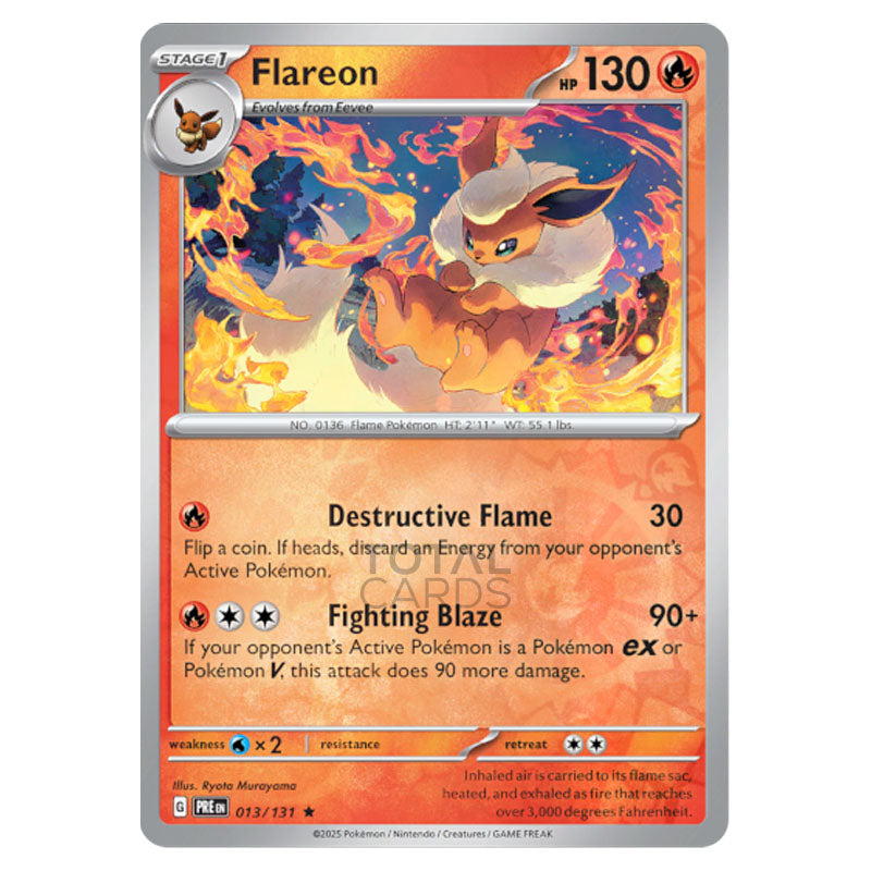 Flareon is a Rare (Stage 1) Fire type Pokémon card from SV8.5 - Prismatic Evolutons Reverse Holo (013/131)