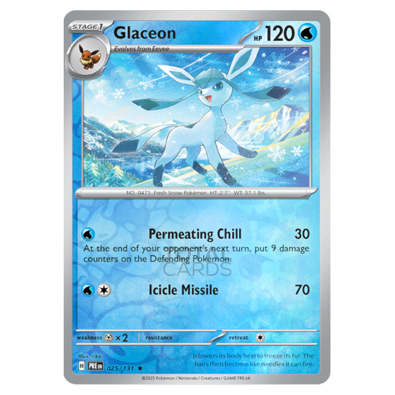Glaceon is a Rare (Stage 1) Water type Pokémon card from SV8.5 - Prismatic Evolutons Reverse Holo (025/131)