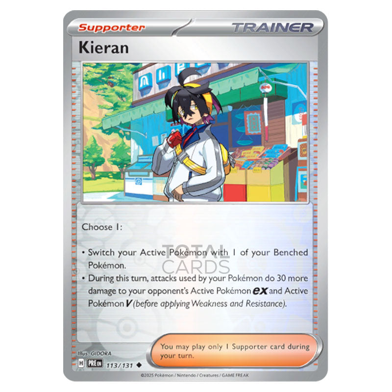 Kieran is a Uncommon (Supporter) type Trainer card from SV8.5 - Prismatic Evolutons Reverse Holo (113/131)