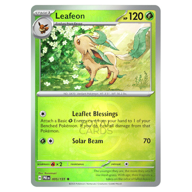 Leafeon is a Rare (Stage 1) Grass type Pokémon card from SV8.5 - Prismatic Evolutons Reverse Holo Master Ball (005/131)