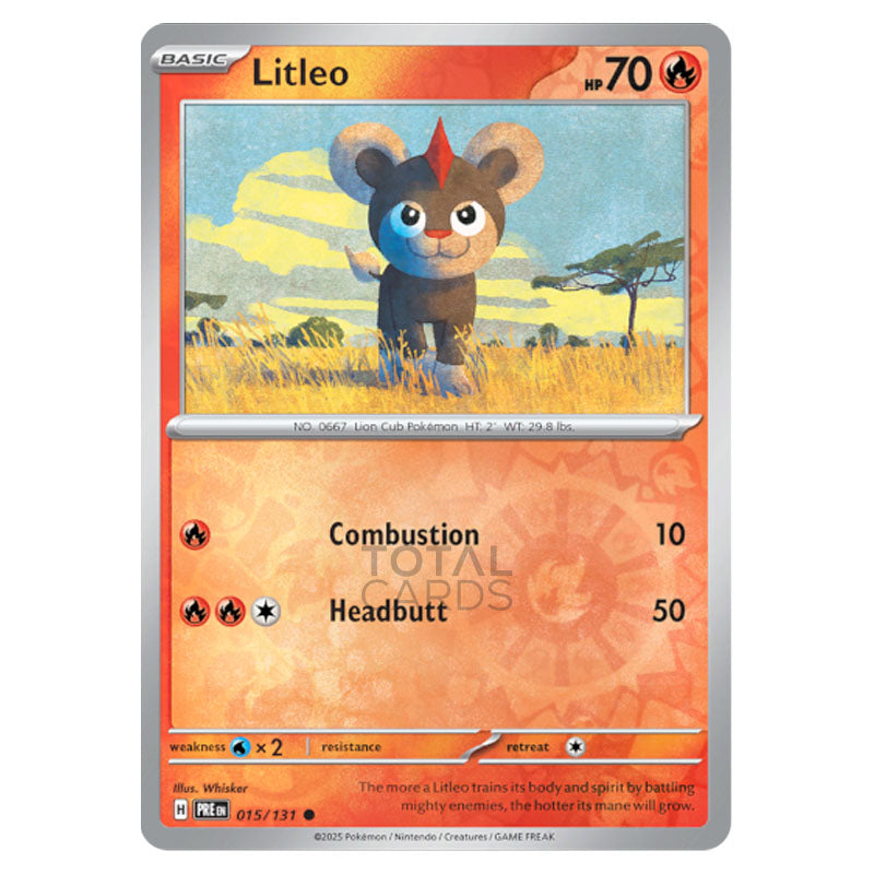 Litleo is a Common (Basic) Fire type Pokémon card from SV8.5 - Prismatic Evolutons Reverse Holo (015/131)