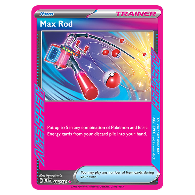 Max Rod is a ACE SPEC Rare (Item) type Trainer card from SV8.5 - Prismatic Evolutons (116/131)