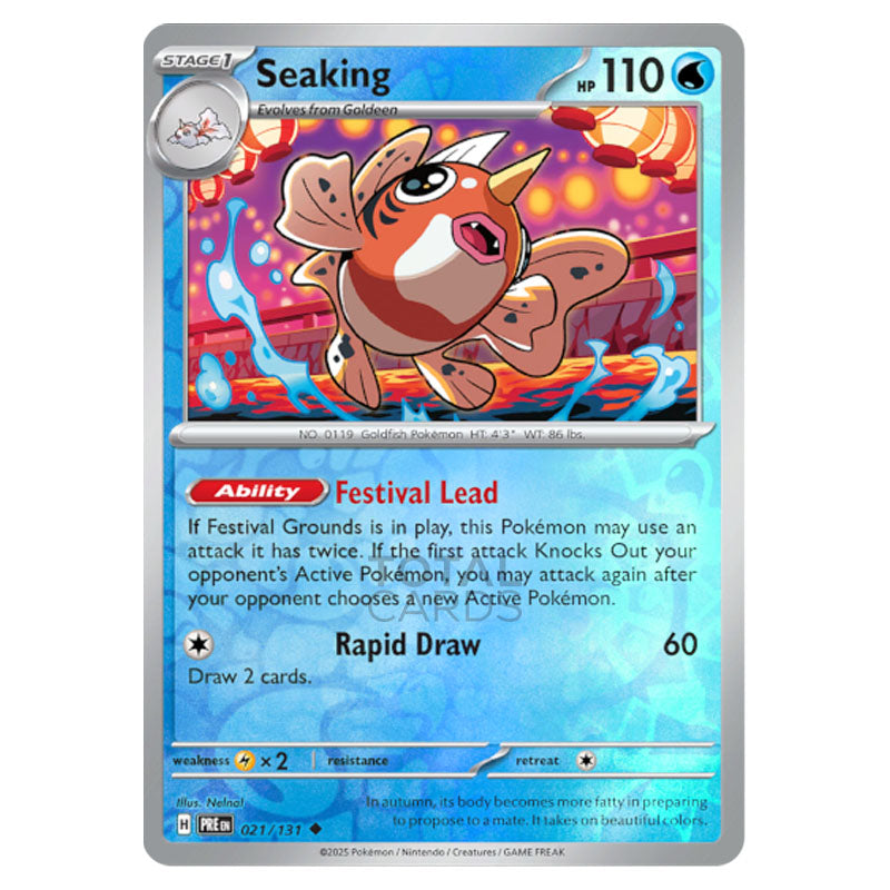 Seaking is a Uncommon (Stage 1) Water type Pokémon card from SV8.5 - Prismatic Evolutons Reverse Holo (021/131)