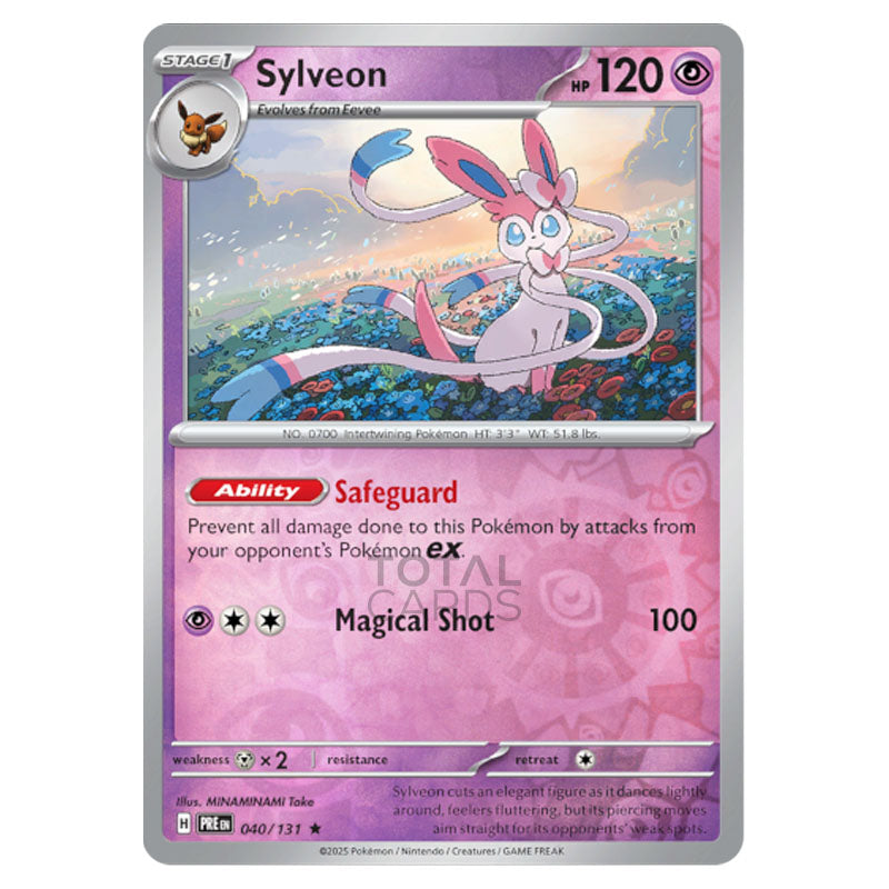 Sylveon is a Rare (Stage 1) Psychic type Pokémon card from SV8.5 - Prismatic Evolutons Reverse Holo (040/131)