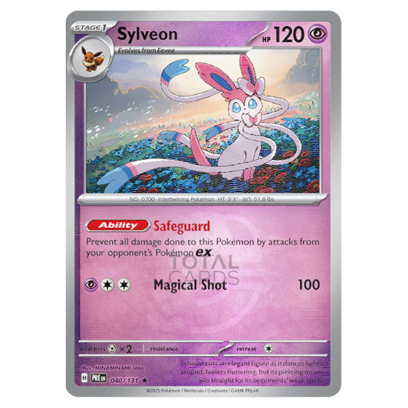Sylveon is a Rare (Stage 1) Psychic type Pokémon card from SV8.5 - Prismatic Evolutons Reverse Holo Master Ball (040/131)