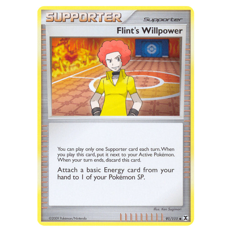 Flint's Willpower is a Uncommon (Supporter) type Trainer card from PL2 - Rising Rivals (091/111)