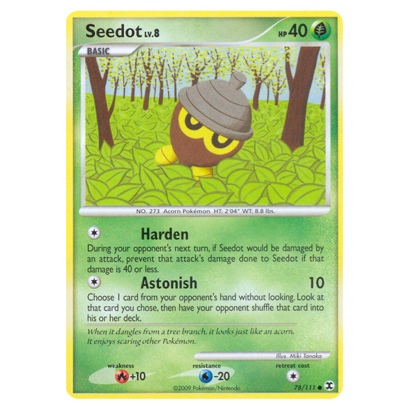 Seedot is a Common (Basic) 40 type Pokémon card from PL2 - Rising Rivals Reverse Holo (078/111)