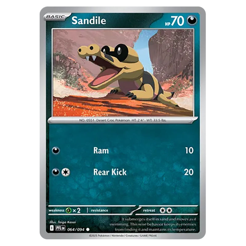 Sandile is a Common Darkness type card from Mega Evolution - Phantasmal Flames Reverse Holo (064/132)