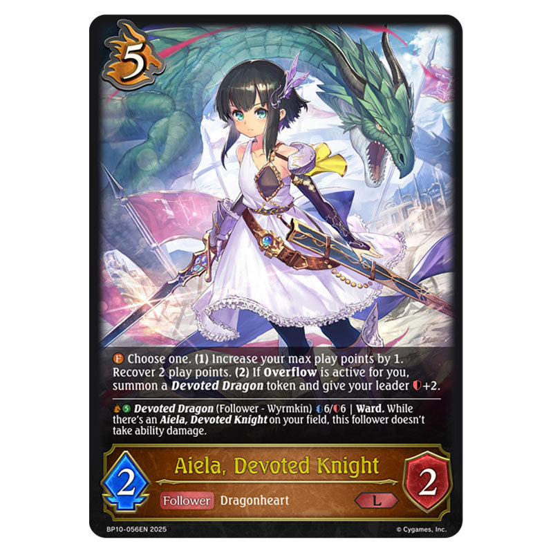 Aiela, Devoted Knight is a Dragonheart card from the Shadowverse Evolve set Gods of the Arcana (BP10-056EN)