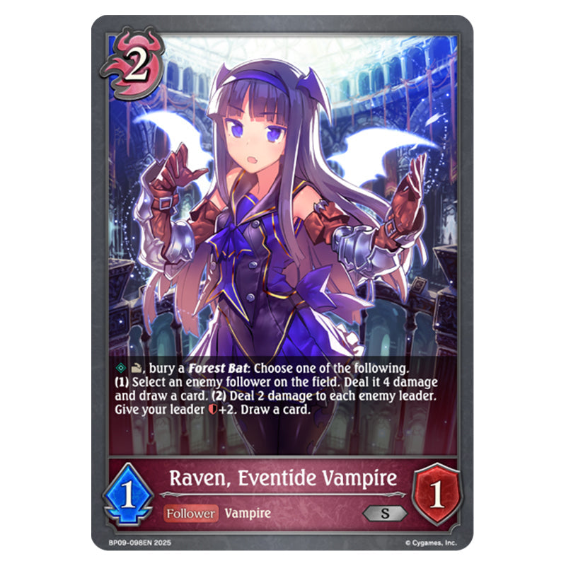 Raven, Eventide Vampire is a Follower card from the Shadowverse Evolve set Duet of Dawn and Dusk (BP09-098EN)