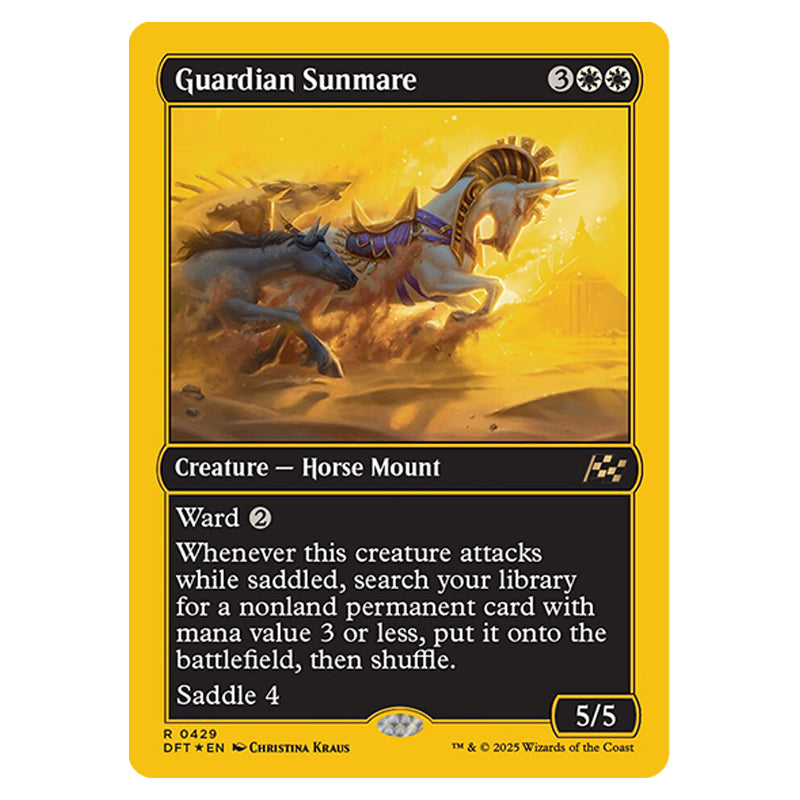 Guardian Sunmare is a Rare, Creature - Horse Mount card from the Magic The Gathering set Aetherdrift (MTGSC-DFT-0429)