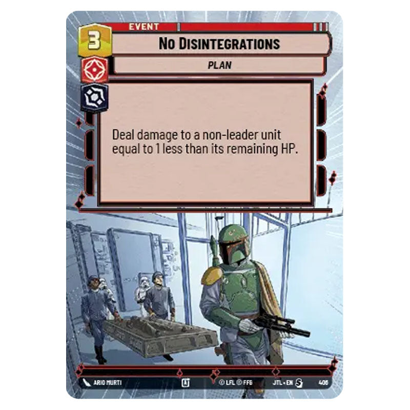 No Disintegrations is a Special hyperspace card from the Star Wars Unlimited set Jump to Lightspeed (406)