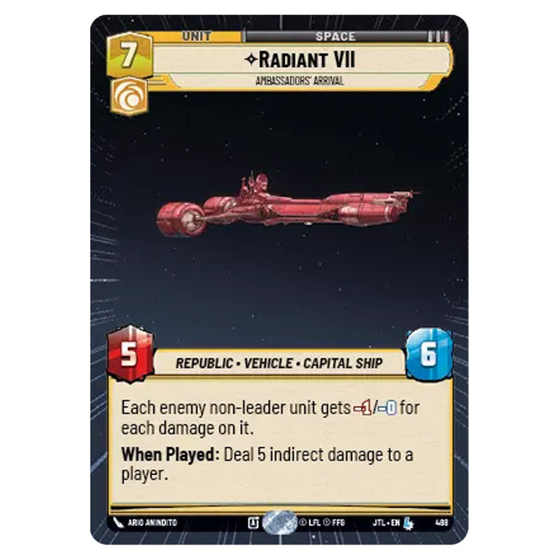 Radiant VII Ambassadors' Arrival is a Legendary hyperspace card from the Star Wars Unlimited set Jump to Lightspeed (488)