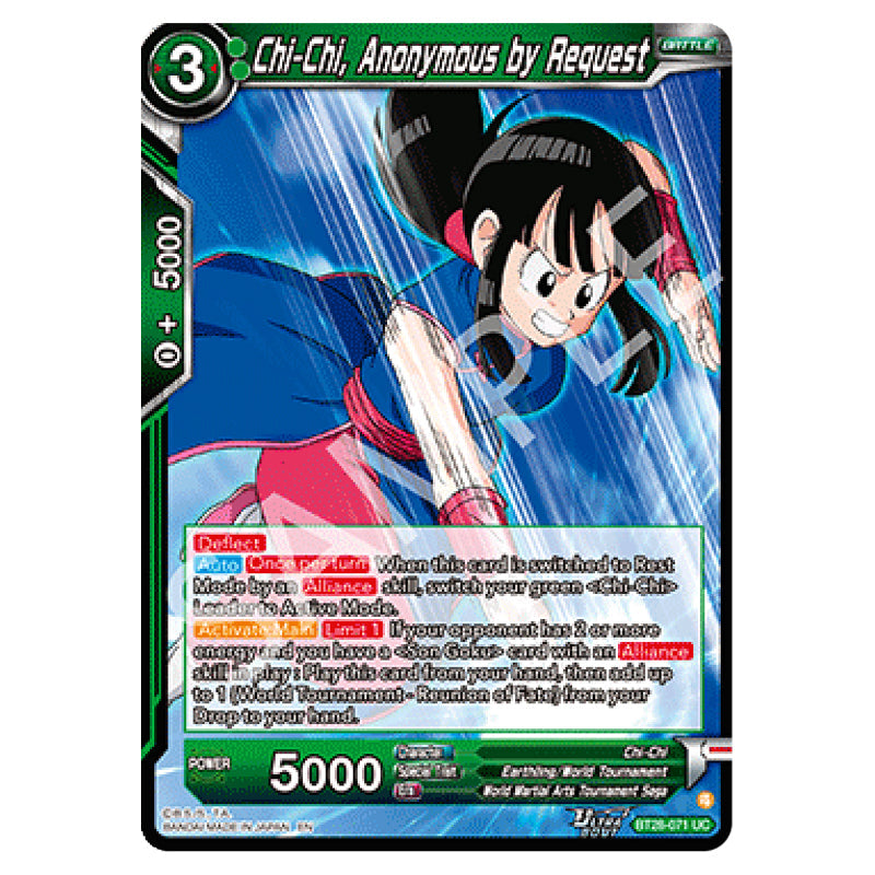 Chi-Chi, Anonymous by Request is a Uncommon, BATTLE card from the Dragon Ball Super set Prismatic Clash (B28-071)