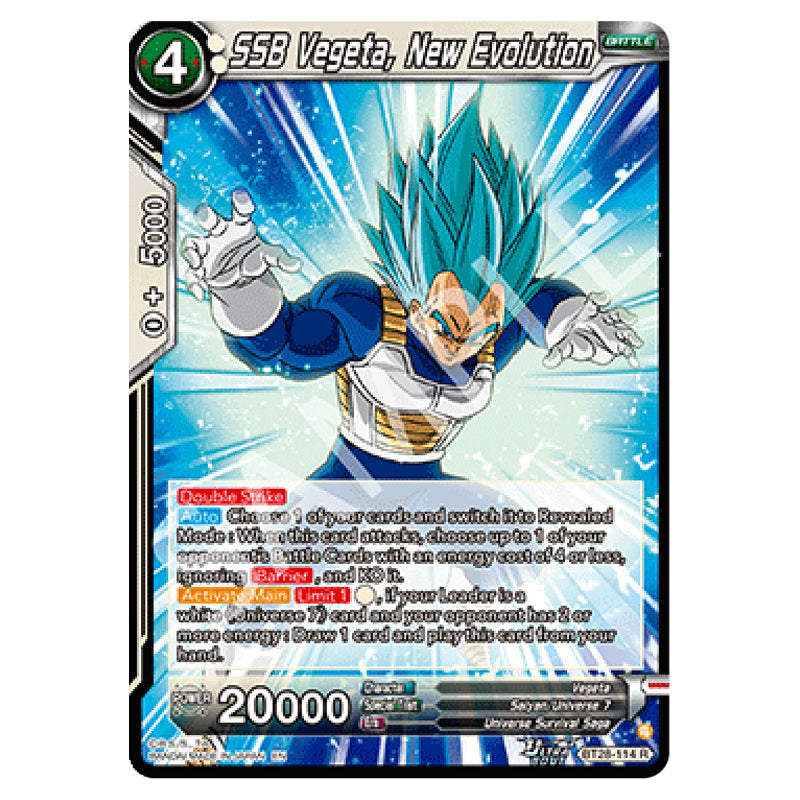 SSB Vegeta, New Evolution is a Rare, BATTLE card from the Dragon Ball Super set Prismatic Clash (B28-114)