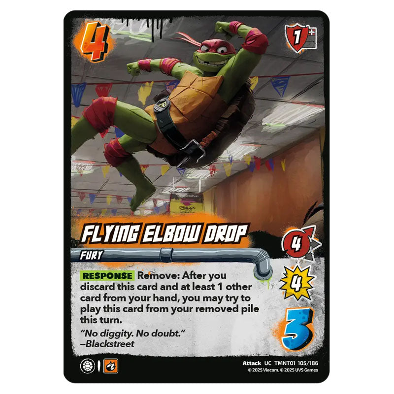 Flying Elbow Drop is a Uncommon Attack card from the Universus set Teenage Mutant Ninja Turtles