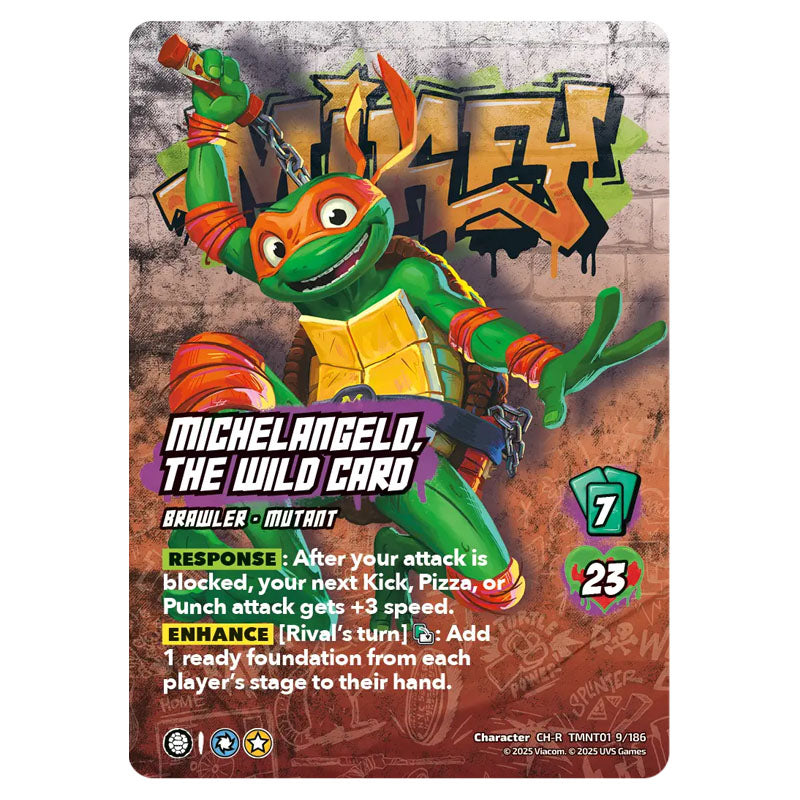 Michelangelo, The Wild Card is a Rare Character card from the Universus set Teenage Mutant Ninja Turtles
