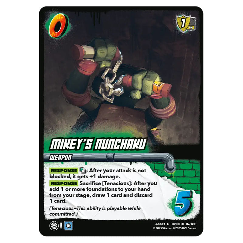 Mikey's Nunchaku is a Rare Asset card from the Universus set Teenage Mutant Ninja Turtles