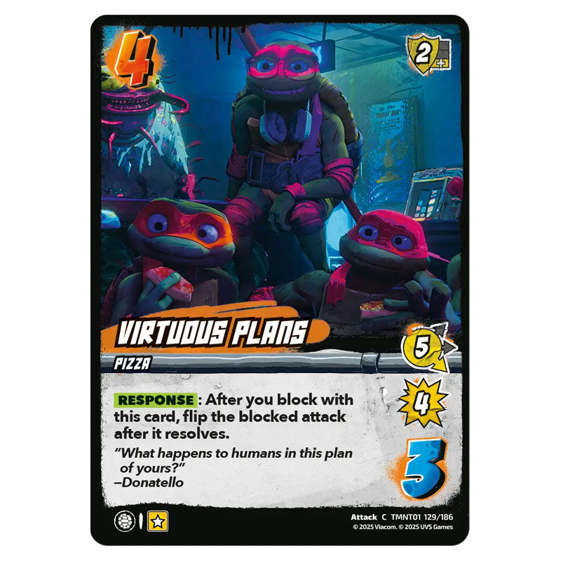 Virtuous Plans is a Common Attack card from the Universus set Teenage Mutant Ninja Turtles
