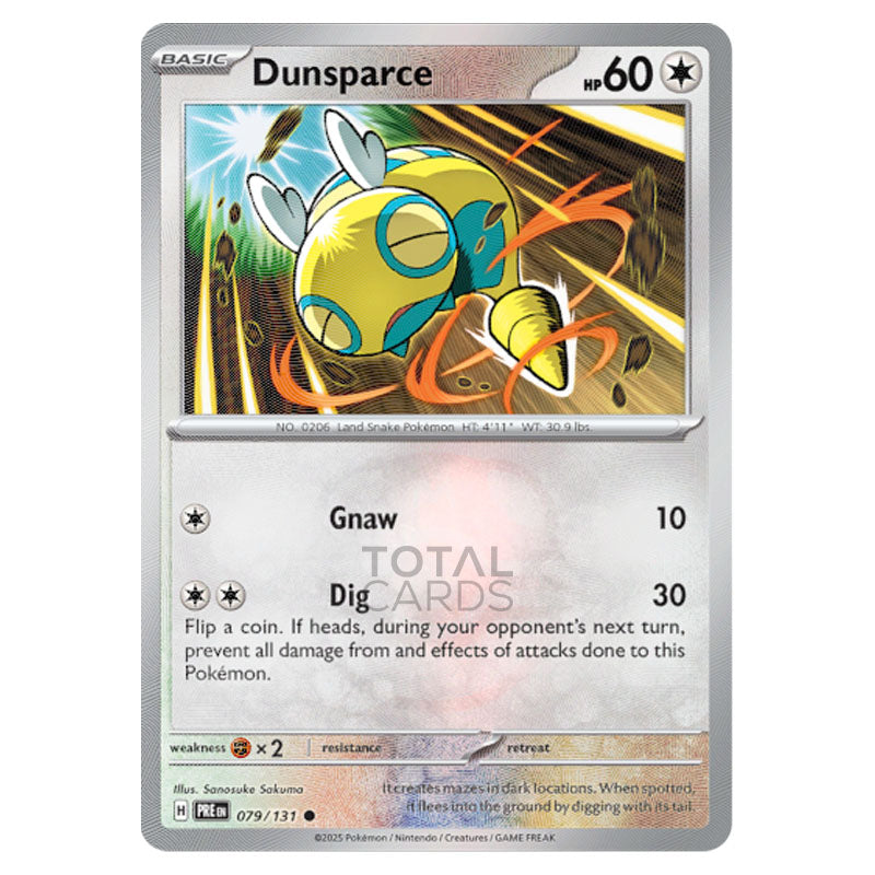 Dunsparce is a Common (Basic) Colorless type Pokémon card from SV8.5 - Prismatic Evolutons Reverse Holo Master Ball (079/131)