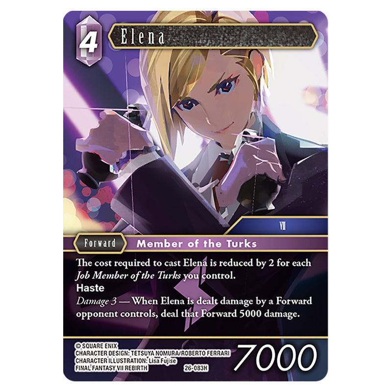 Elena is a Hero (Forward / Lightning) foil card from the Final Fantasy set Gunslinger in the Abyss (26-083H)
