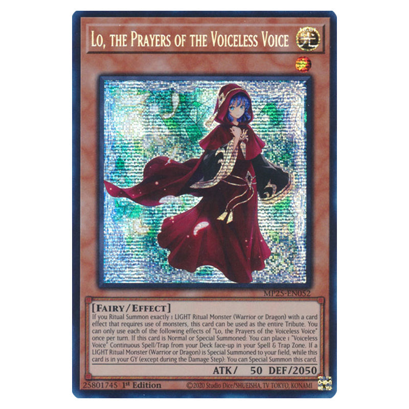 Lo, the Prayers of the Voiceless Voice is a Prismatic Secret Rare, Effect Monster from the Yugioh set 2025 Mega Pack (MP25-EN052)