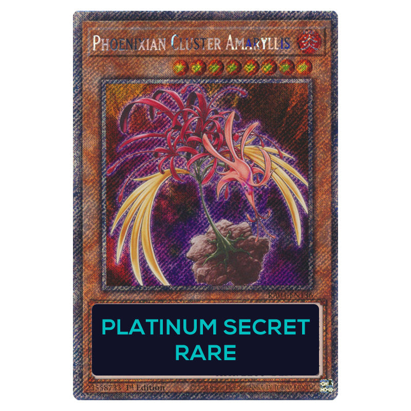 Phoenixian Cluster Amaryllis is a Platinum Secret Rare, Effect Monster from the Yugioh set Quarter Century Stampede (RA04-EN136-PSR)