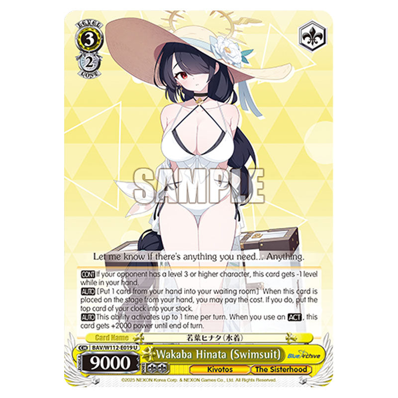 Wakaba Hinata (Swimsuit) is a U Yellow Character card from the Weiss Schwarz set Blue Archive (WSSC-BAV/W112-E019)