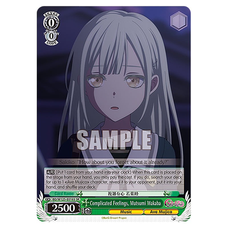 Complicated Feelings, Mutsumi Wakaba is a SR Green Character card from the Weiss Schwarz set MyGO!!!!! × Ave Mujica (WSSC-BD/W125-E016S) 【AUTO】 [Put 1 card from your hand into your clock] When this card is placed on the stage from your hand, you may pay the cost. If you do, search your deck for up to 1 《Ave Mujica》 character, reveal it to your opponent, put it into your hand, and shuffle your deck.
