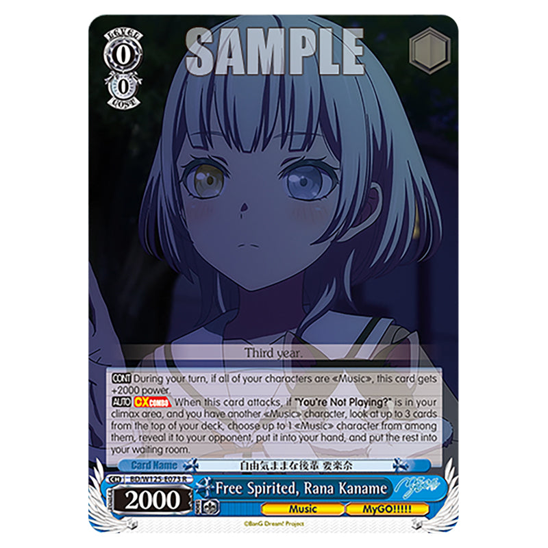 Free Spirited, Rana Kaname is a R Blue Character card from the Weiss Schwarz set MyGO!!!!! × Ave Mujica (WSSC-BD/W125-E073) 【CONT】 During your turn, if all of your characters are 《Music》, this card gets +2000 power. 【AUTO】 【CXCOMBO】 When this card attacks, if "You're Not Playing?" is in your climax area, and you have another 《Music》 character, look at up to 3 cards from the top of your deck, choose up to 1 《Music》 character from among them, reveal it to your opponent, put it into your hand, and put the rest into your waiting room.
