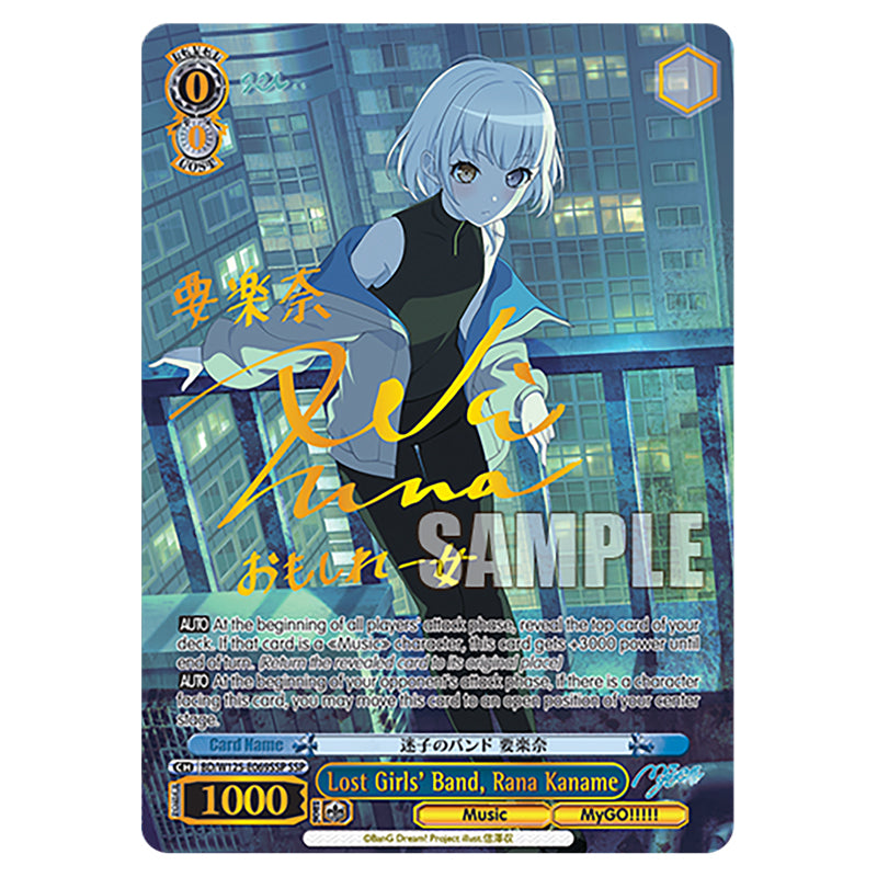 Lost Girls' Band, Rana Kaname is a SSP Blue Character card from the Weiss Schwarz set MyGO!!!!! × Ave Mujica (WSSC-BD/W125-E069SSP) 【AUTO】 At the beginning of all players' attack phase, reveal the top card of your deck. If that card is a 《Music》 character, this card gets +3000 power until end of turn. (Return the revealed card to its original place) 【AUTO】 At the beginning of your opponent's attack phase, if there is a character facing this card, you may move this card to an open position of your center stage.