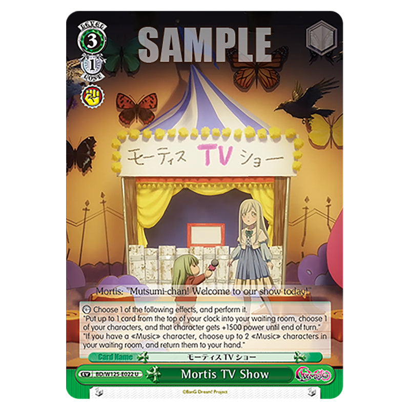 Mortis TV Show is a U Green Event card from the Weiss Schwarz set MyGO!!!!! × Ave Mujica (WSSC-BD/W125-E022) 【COUNTER】 Choose 1 of the following effects, and perform it. "Put up to 1 card from the top of your clock into your waiting room, choose 1 of your characters, and that character gets +1500 power until end of turn." "If you have a 《Music》 character, choose up to 2 《Music》 characters in your waiting room, and return them to your hand."