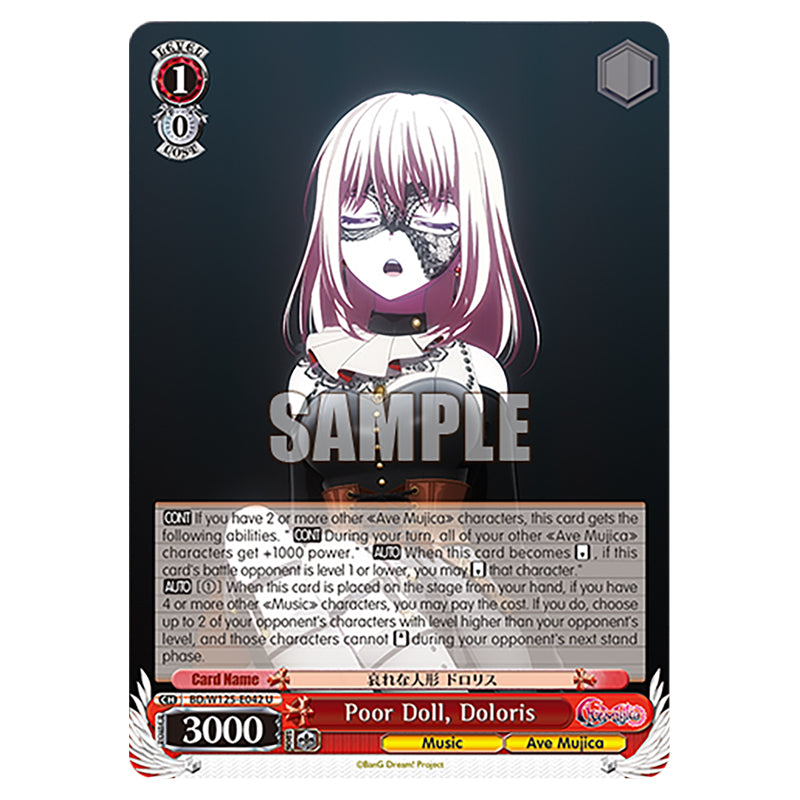 Poor Doll, Doloris is a U Red Character card from the Weiss Schwarz set MyGO!!!!! × Ave Mujica (WSSC-BD/W125-E042) 【CONT】 If you have 2 or more other 《Ave Mujica》 characters, this card gets the following abilities. "【CONT】 During your turn, all of your other 《Ave Mujica》 characters get +1000 power." "【AUTO】 When this card becomes 【REVERSE】, if this card's battle opponent is level 1 or lower, you may 【REVERSE】 that character." 【AUTO】 [(1)] When this card is placed on the stage from your hand, if you have 4 or more other 《Music》 characters, you may pay the cost. If you do, choose up to 2 of your opponent's characters with level higher than your opponent's level, and those characters cannot 【STAND】 during your opponent's next stand phase.